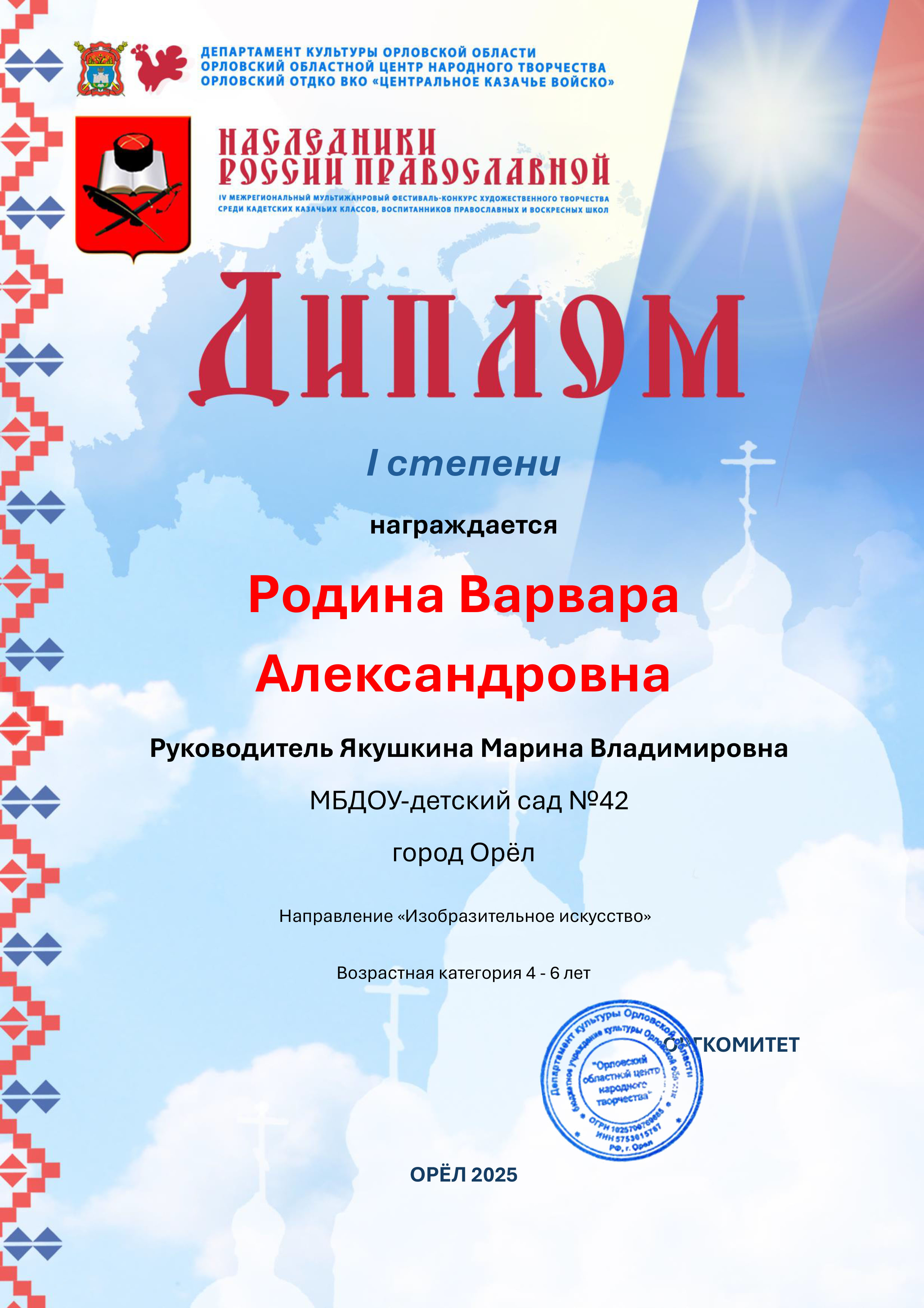 Поздравляем воспитанницу нашего ДОУ Слизникову Анастасию с победой в городском-патриотическом конкурсе "Я-России патриот!" по творчеству орловской поэтессы, композитора, автора-исполнителя, лауреата литературной премии Петра Проскурина и Международных конкурсов Людмилы Внуковой.